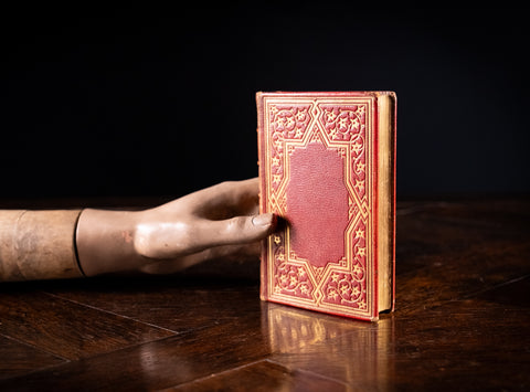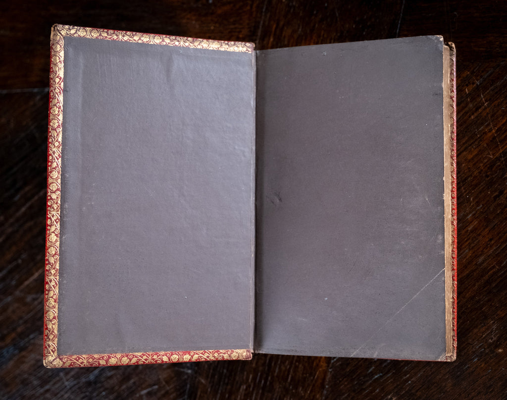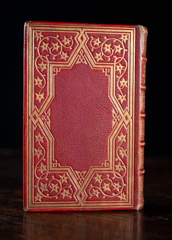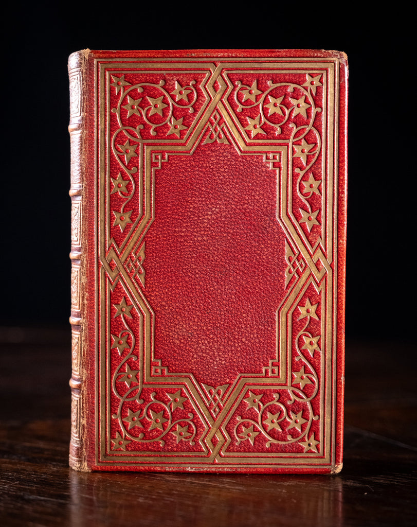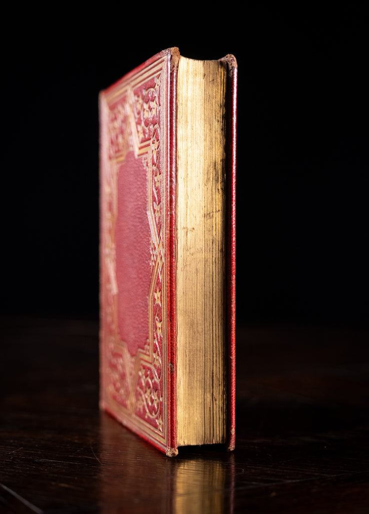 Full red leather binding with gilt stamped decoration throughout the boards, spine and edges. Gilt page edges.