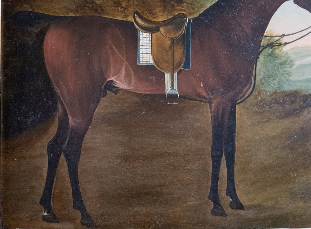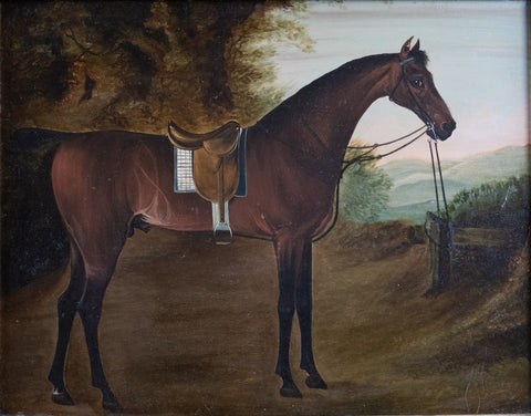 The Bay horse is stood in a rural landscape with rolling hills to the background. The horse is in full saddlery and gazing out of the portrait. There is a small area of paint loss to one ear and some very small scratches in places but generally the work displays very well.