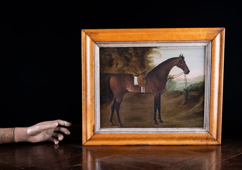 An early 19th century portrait of a bay hunter horse. Oil on panel. Probably English School. Unsigned.