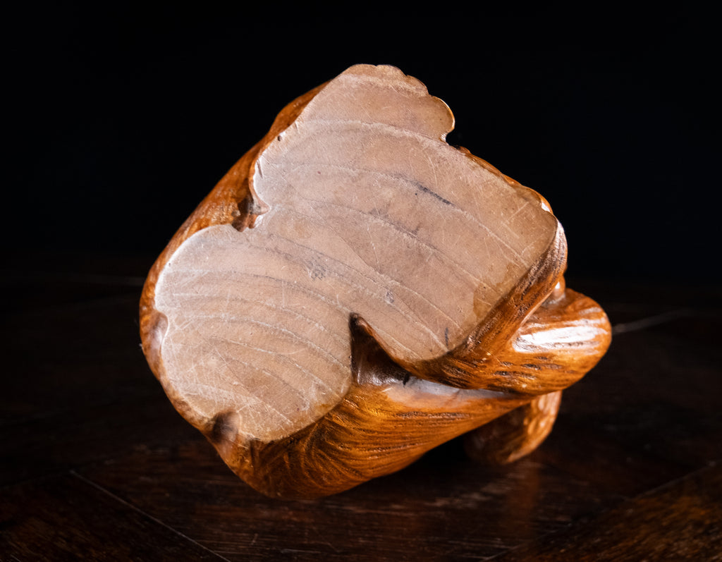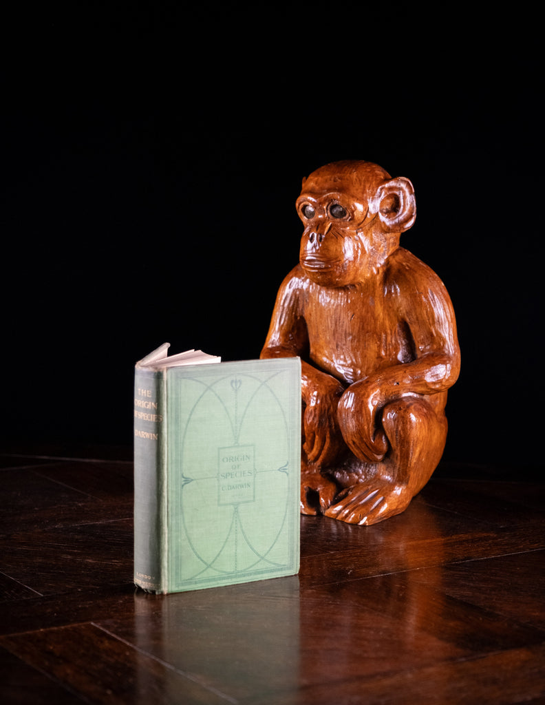 A fantastic carved monkey of large proportions, circa early 20th century. Traces of a Chinese stamp to the underside. The wood is unidentified but is very light.