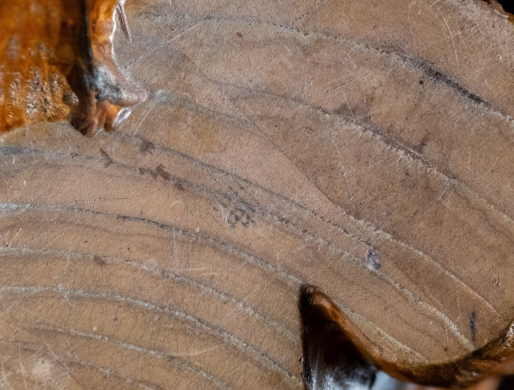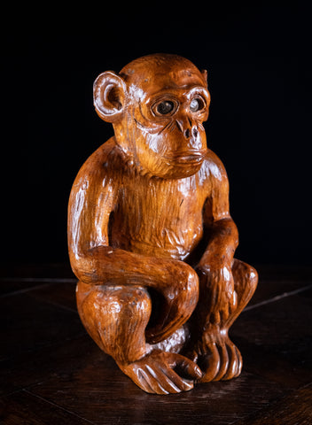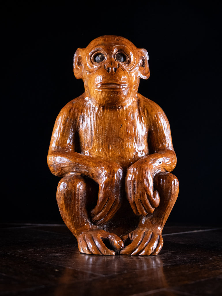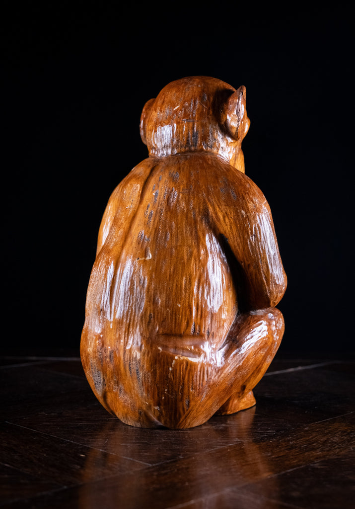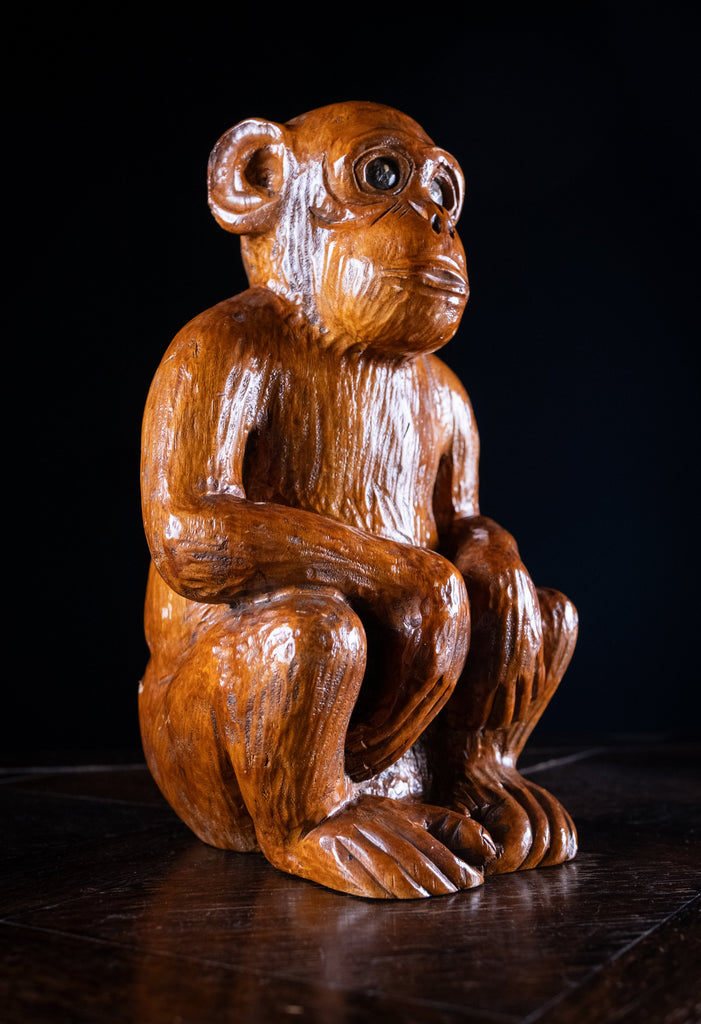 The monkey is sat with its arms resting on its knees in an attentive manner. The carved eyes are painted black and the body has deep grooving throughout to mimic fur.