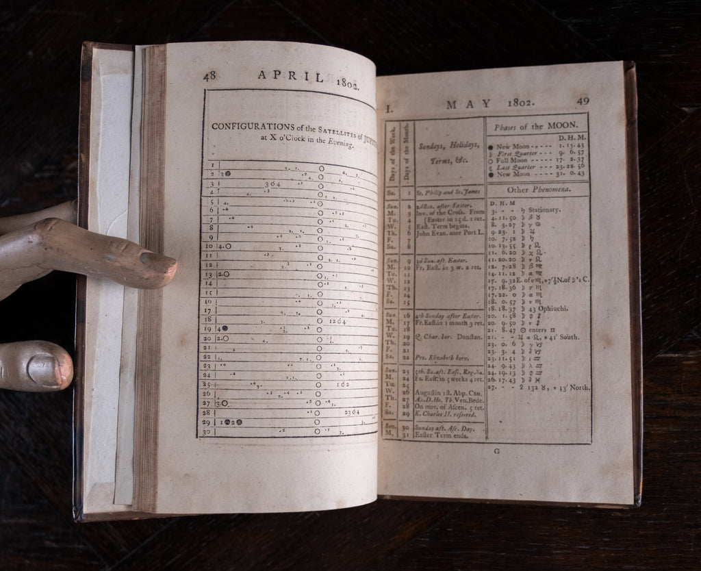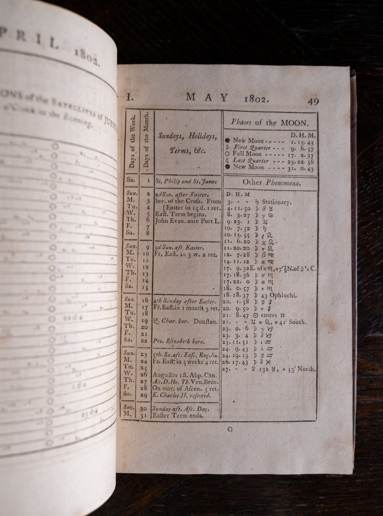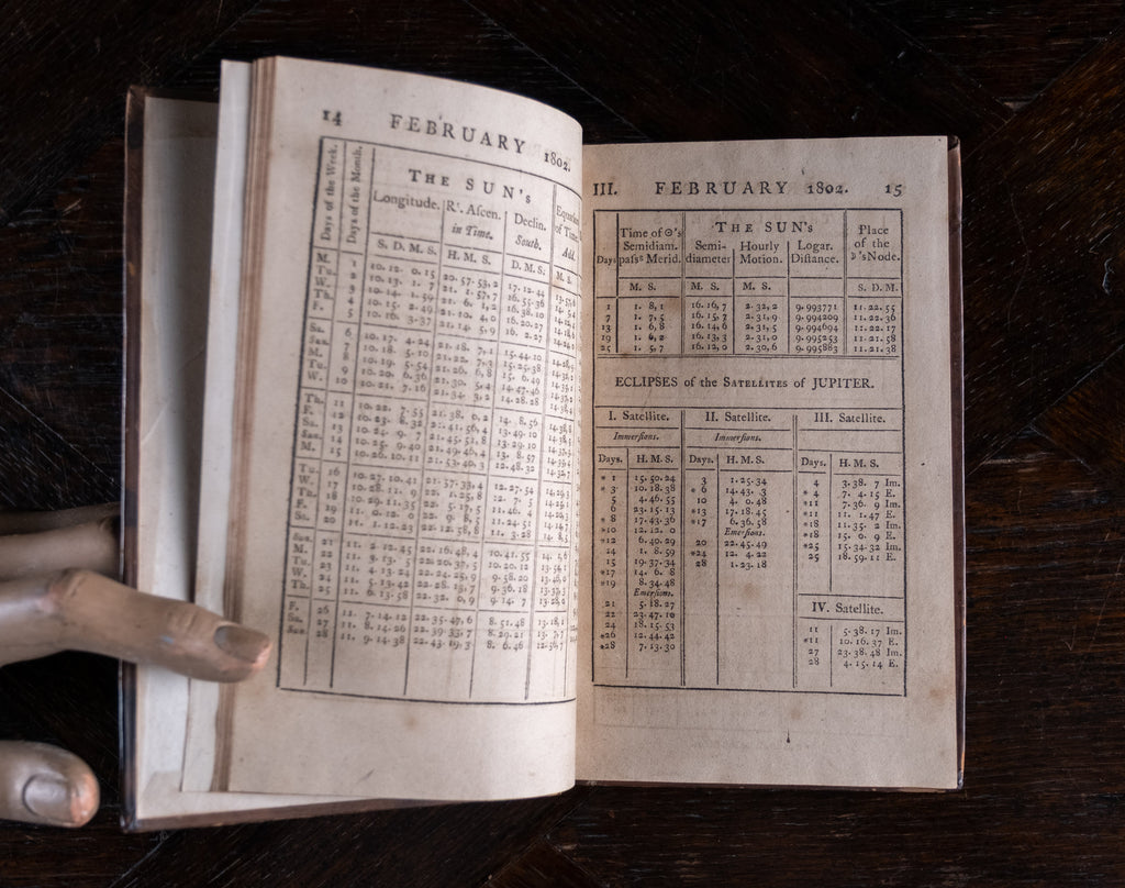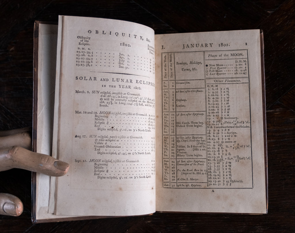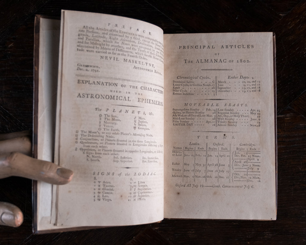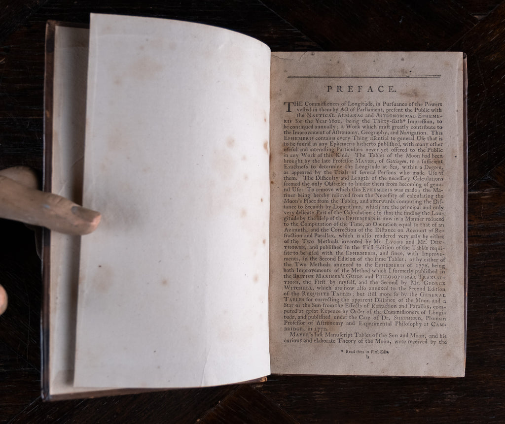 'Nautical Almanac and Astronomical Ephemeris For The Year 1802', published by the Commissioners of Longitude, printed by C. Buckton, London, c.1796. Thirty-sixth impression.