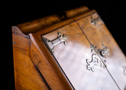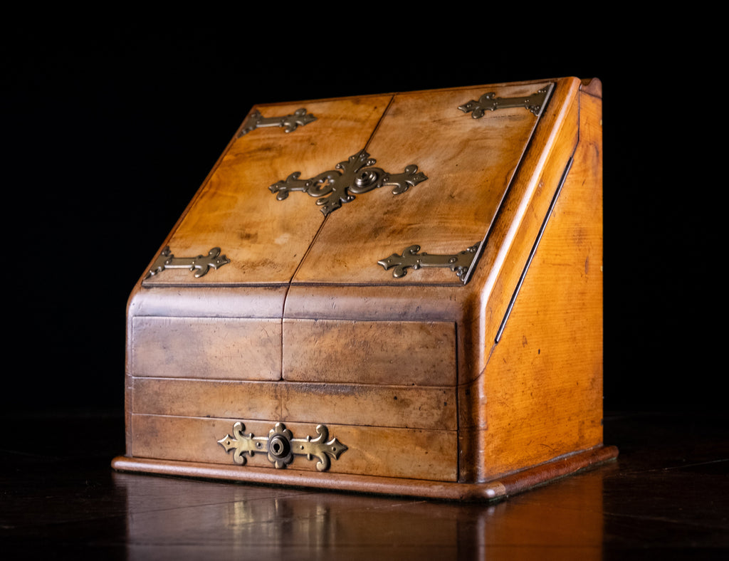 The cabinet boasts high quality brass banding in the gothic taste with brass Bramah locks to the cupboard and drawer (keys absent). Pen rest to the top. The cabinet opens to reveal multiple compartments and a removable pen rest. Green baize lining to base.