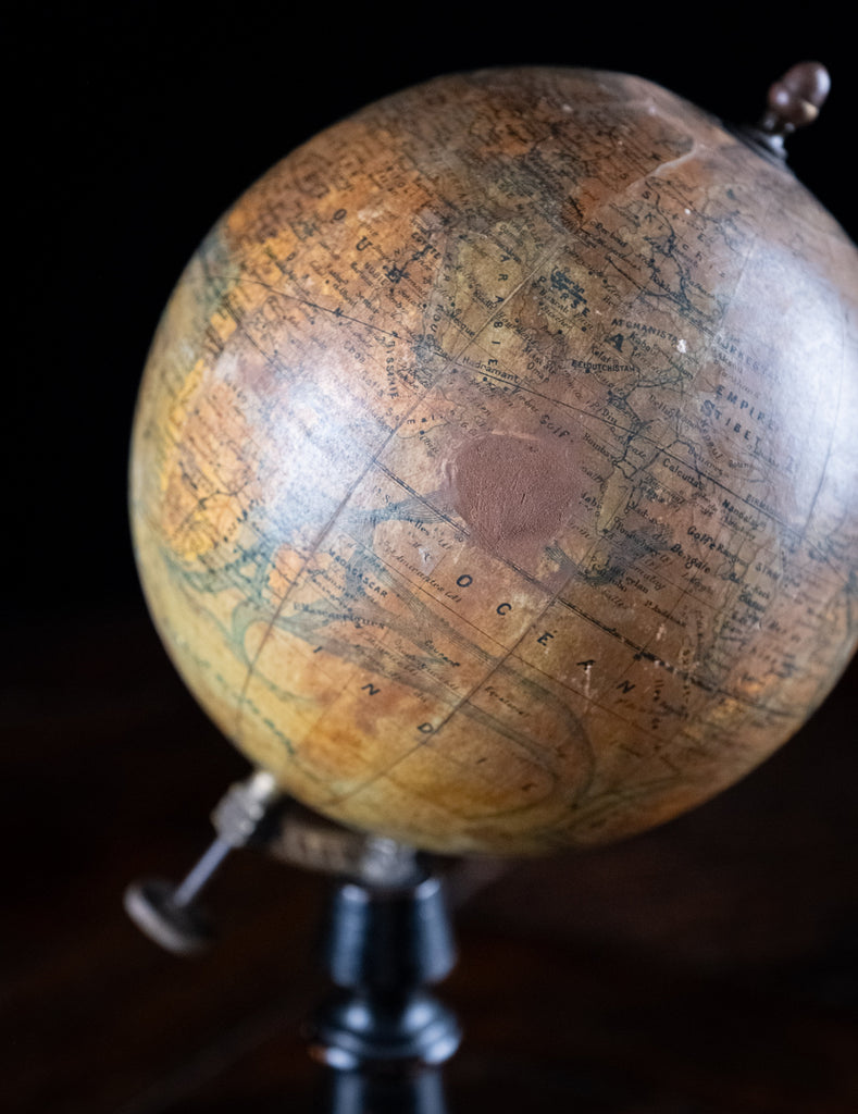 There is an historic repair to the globe near the 'Seychelles' (please see images). Generally, the globe displays well with an attractive 'time-worn' patina throughout and lovely proportions; small enough to sit quietly on a desk, yet large enough to be a statement on a shelf or mantle.