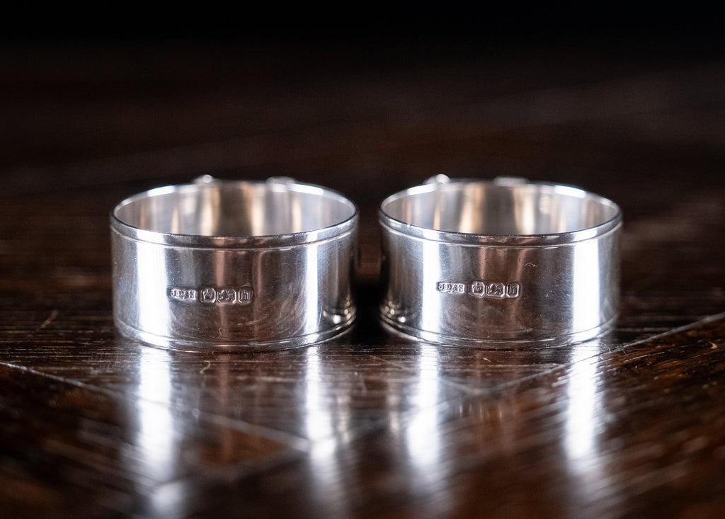 A charming cased pair of novelty silver napkin rings in the form of belts, fully and clearly hallmarked for James Dixon & Sons, Sheffield, 1894.