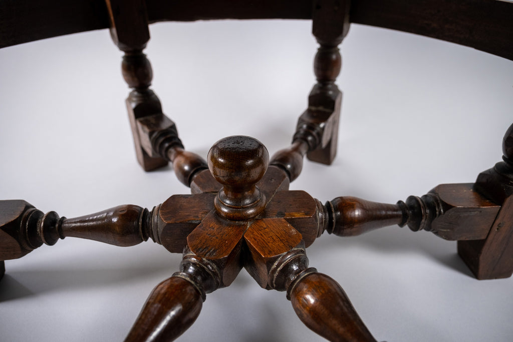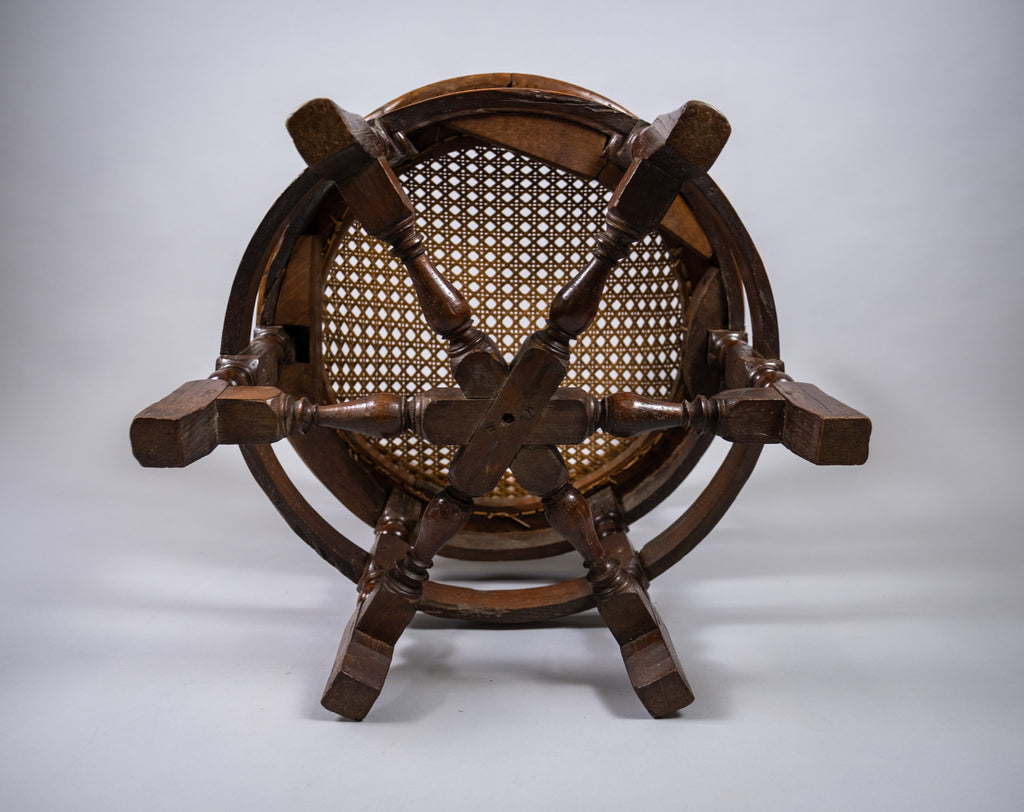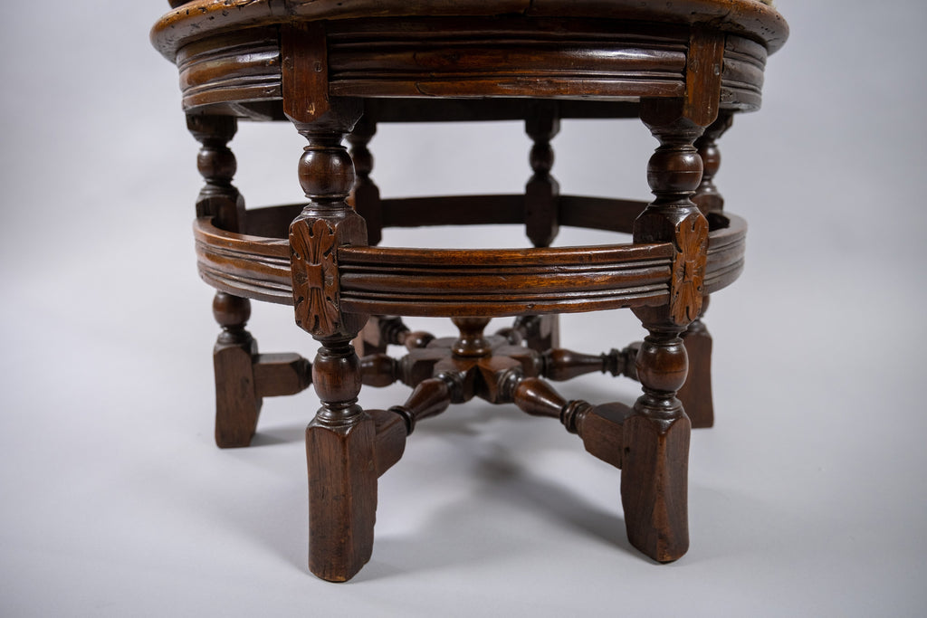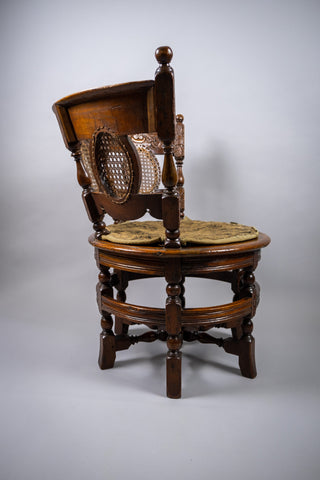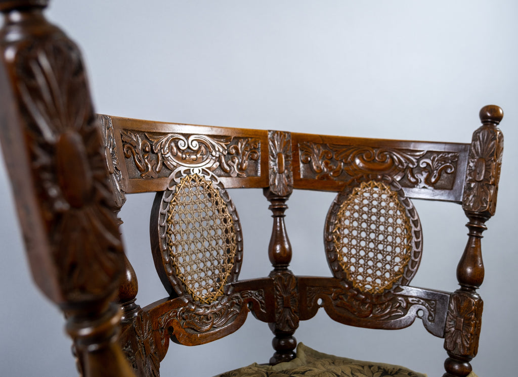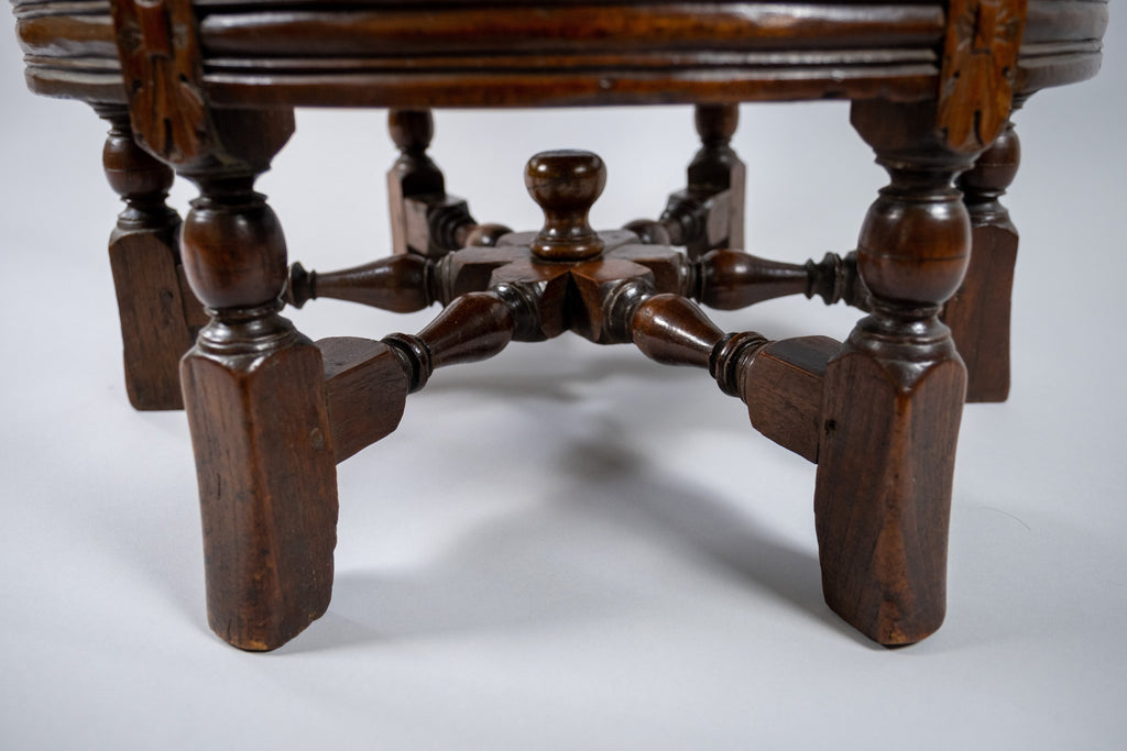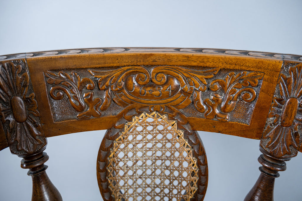 The chair has a carved oak crested rail, dated '1634' to the centre. The back has three leaf and wicker carved roundels above a wicker seat. The seat is raised upon six carved square legs, united by turned stretchers.