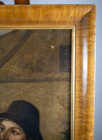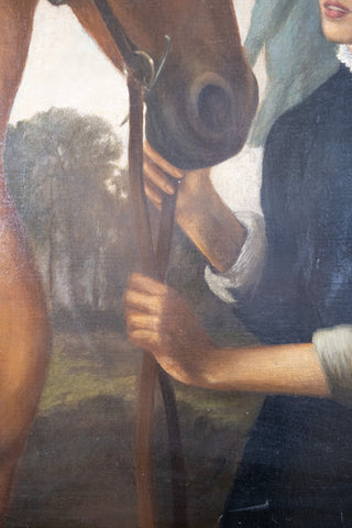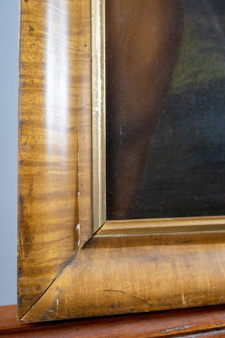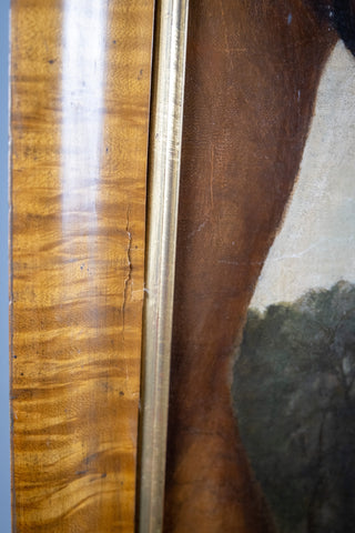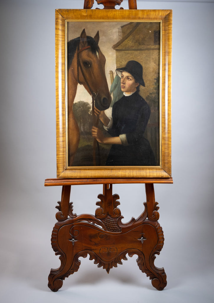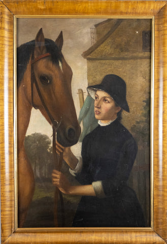 A charming piece of a folk art depicting a horse and rider in front of a house, housed in its original maple frame.