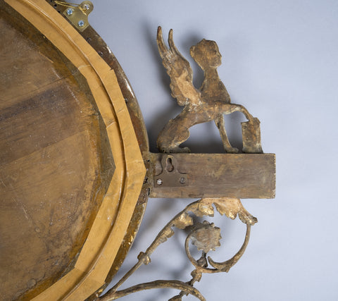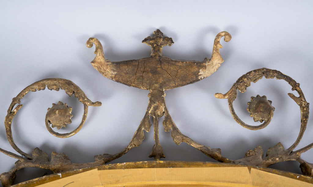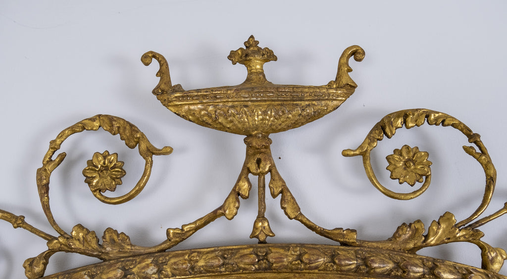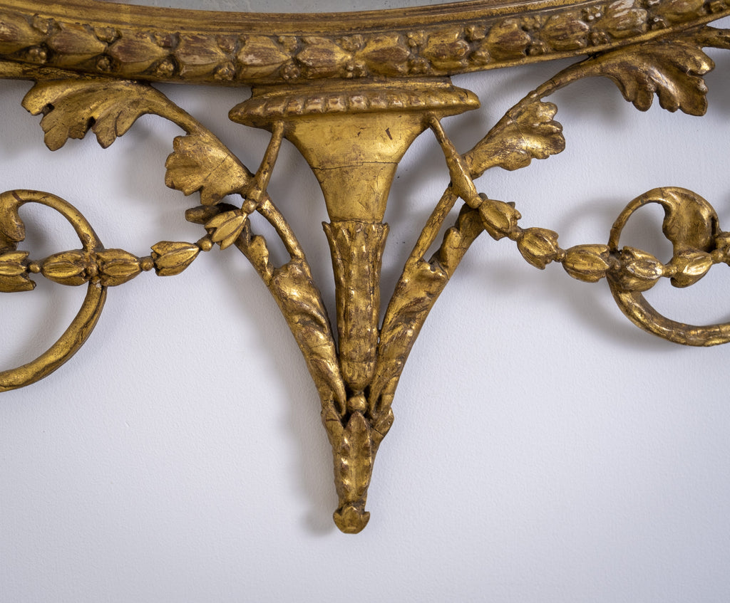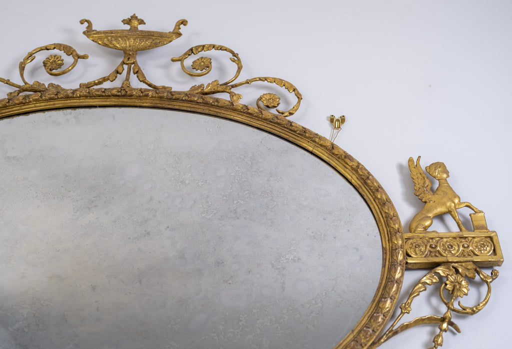 The oval mirror plate is flanked by Sphynx ornaments, swag and harebell decoration and topped with an urn finial. The original mercury mirror plate has foxed beautifully but remains reflective.