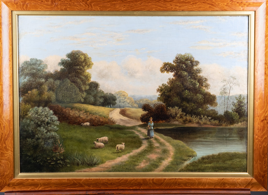 A large late 19th/early 20th century oil on canvas depicting a rural scene with a lady walking by a pond with sheep and a rolling hills to the background. Signed 'T. Morris' to the lower left.
