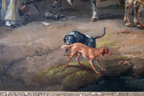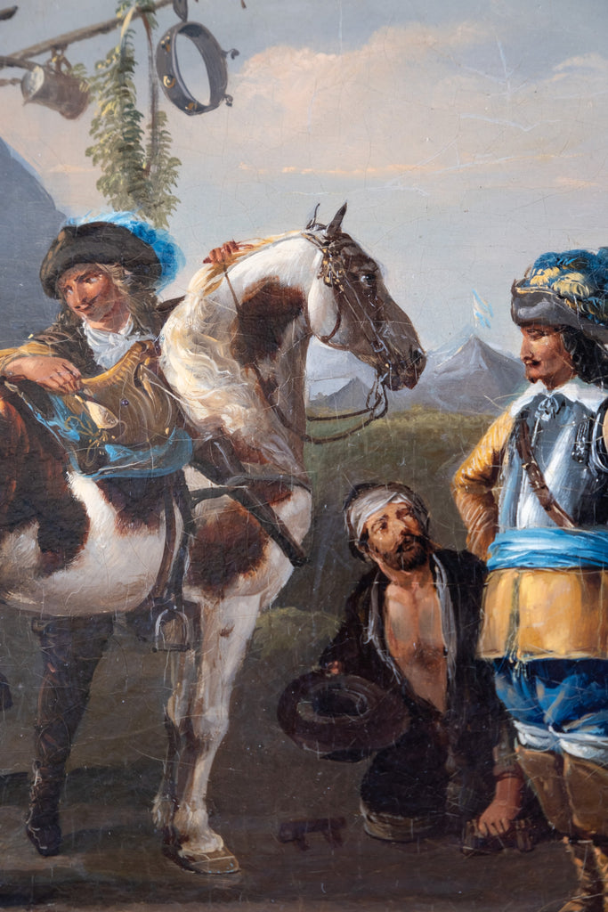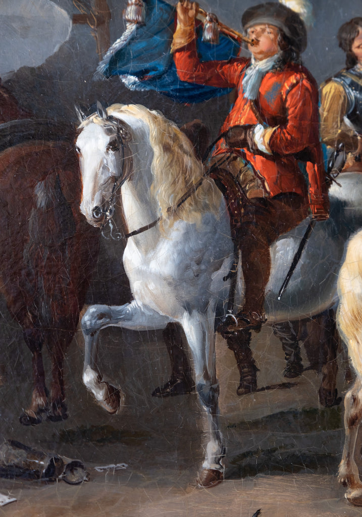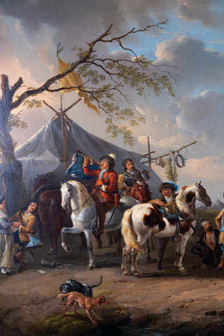 A fine 18th century oil on canvas by a follower of Philips Wouwerman (1619-1668), Dutch School. The work bears striking similarities to Wouwerman's 'The Departure Of The Riders' and 'The Cavalry Camp'.