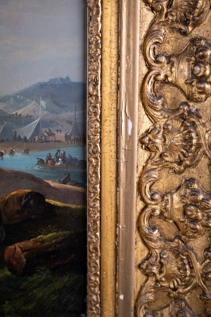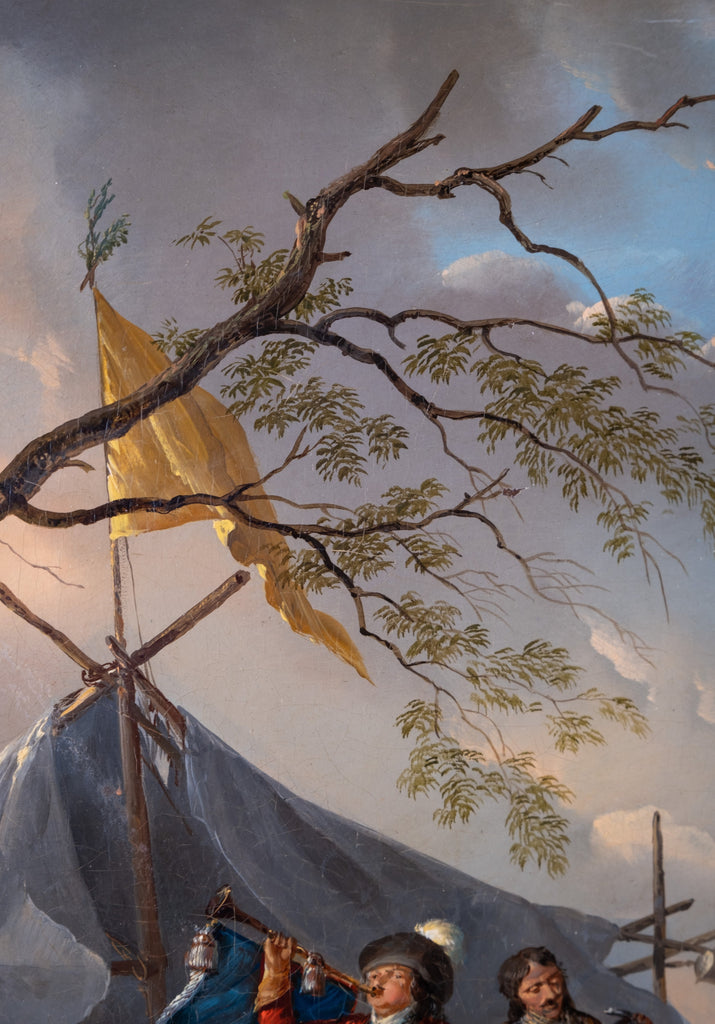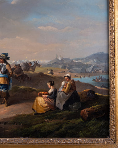 This 18th century work depicts finely painted horses, riders, dogs and women to the foreground, with a lake and large military camp extending into the background, all beneath a golden-hour clouded sky. The sense of scale and use of colour in this work is quite remarkable.