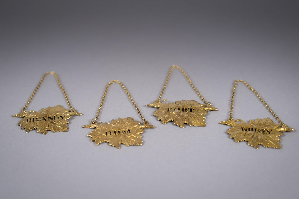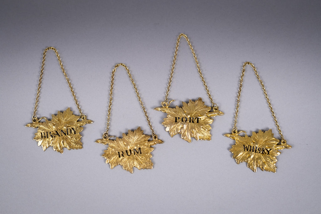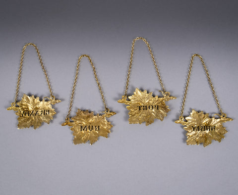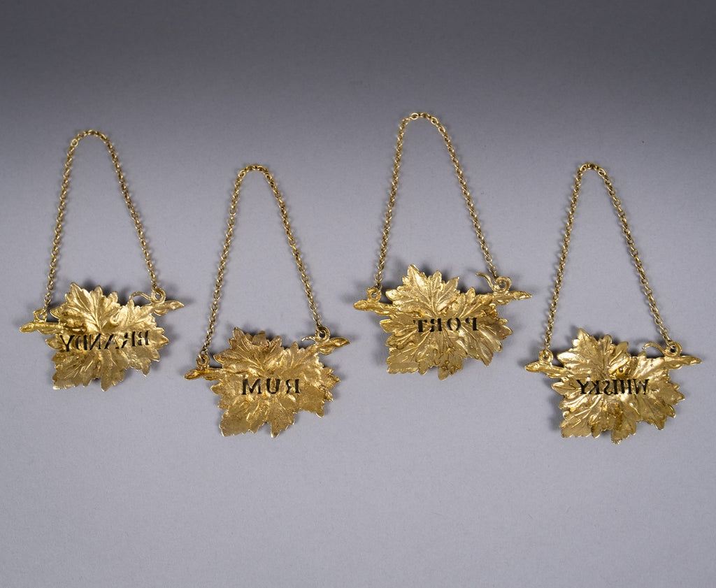 A scarce set of four silver gilt vine leaf decanter labels, each fully hallmarked for silversmiths SMD of London, 1968.