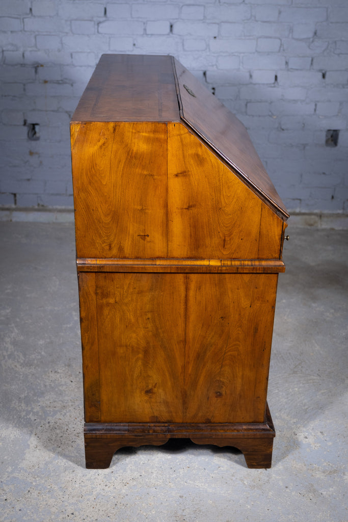 The bureau is of good proportions and boasts a featherbanded enclosed fall front top and featherbanded drawers with double bead carcase moulding. There is an attractive waist moulding but note the bureau is formed of one piece. The drawers and top have bat wing escutcheons consistent with the period. The handles and bracket feet are later replacements. The facia of the right fall-front rest shows historic repair but remains stable. There are a few very minor losses to the extremities in places (please see photographs) but the bureau remains in a good and attractive condition externally.