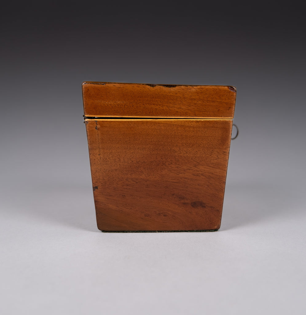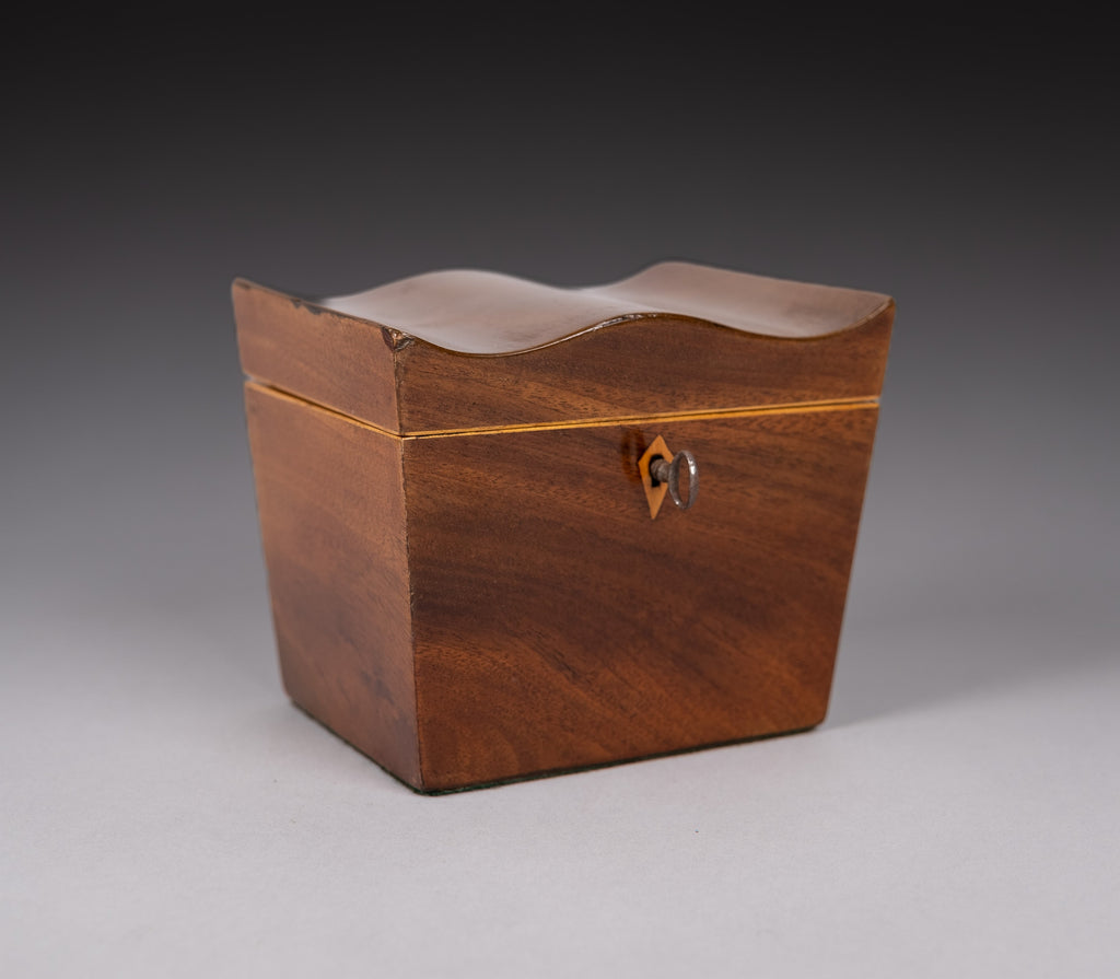 The tea caddy is of unusual form with a serpentine top above a tapered body. The caddy has boxwood inlay to the caddy rim, lid and escutcheon. The top shows some fading (please see photographs) and there are some small nibbles to the extremities in areas.