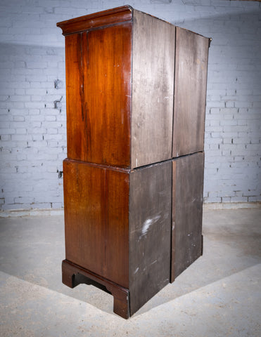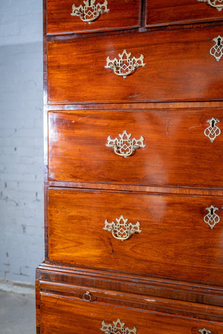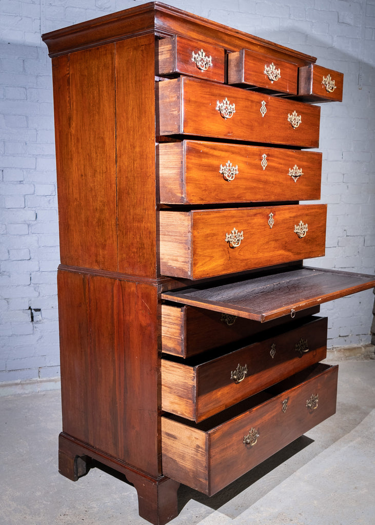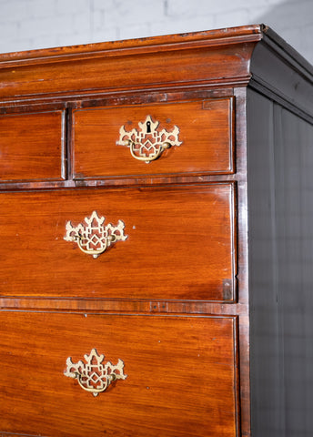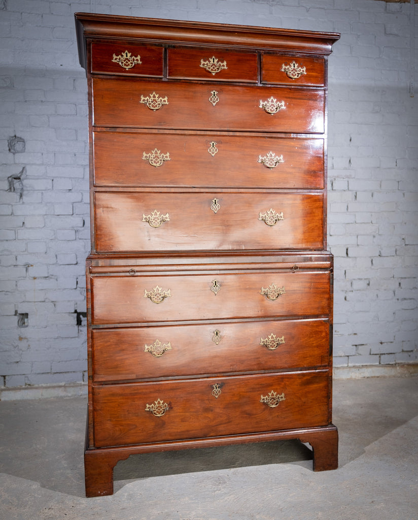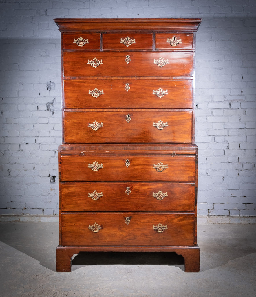 The chest has knocks and wear throughout, most noticeably a chip to the top righthand cornice and middle left hand corner, just below the waist moulding. The whole chest has been re-finished in recent history and boasts a fine glossy finish.