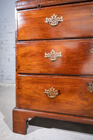 The cornice is over three short and six long drawers, all with Chinoiserie style brasses (later), with a brushing slide to the centre of the piece; the whole is raised upon four bracket feet.