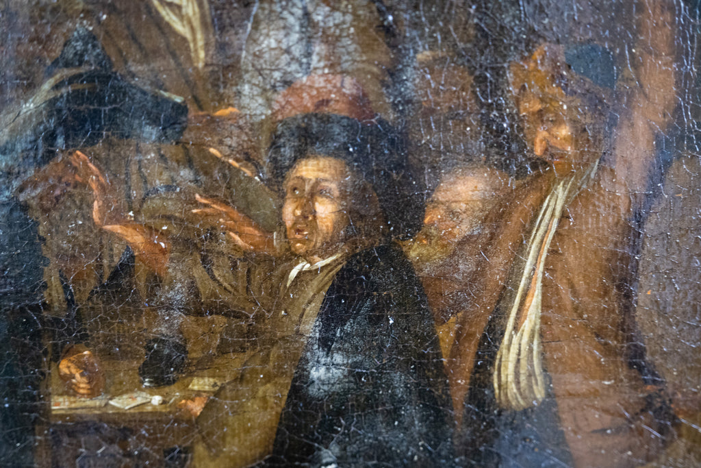 A large 18th century oil on canvas in the manner of Pieter Jansz Quast (1605-1647) depicting a tavern scene in which patrons are fighting over a card game.