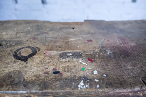 The bench sits upon four splayed feet and has wonderful character and patina throughout, with the top boasting small carved out sections and areas of artists' paint splatter and tin marks from previous owners.