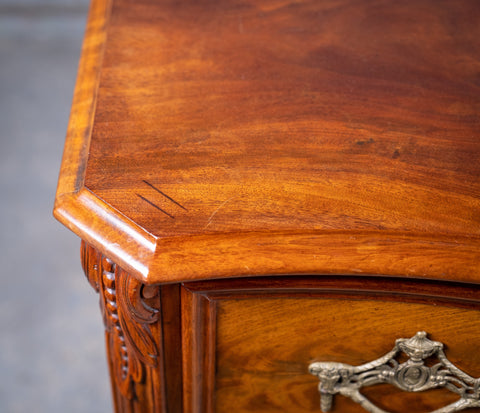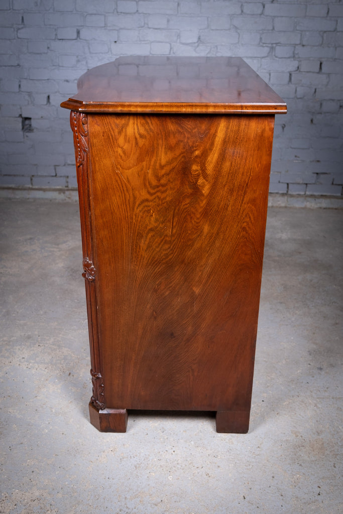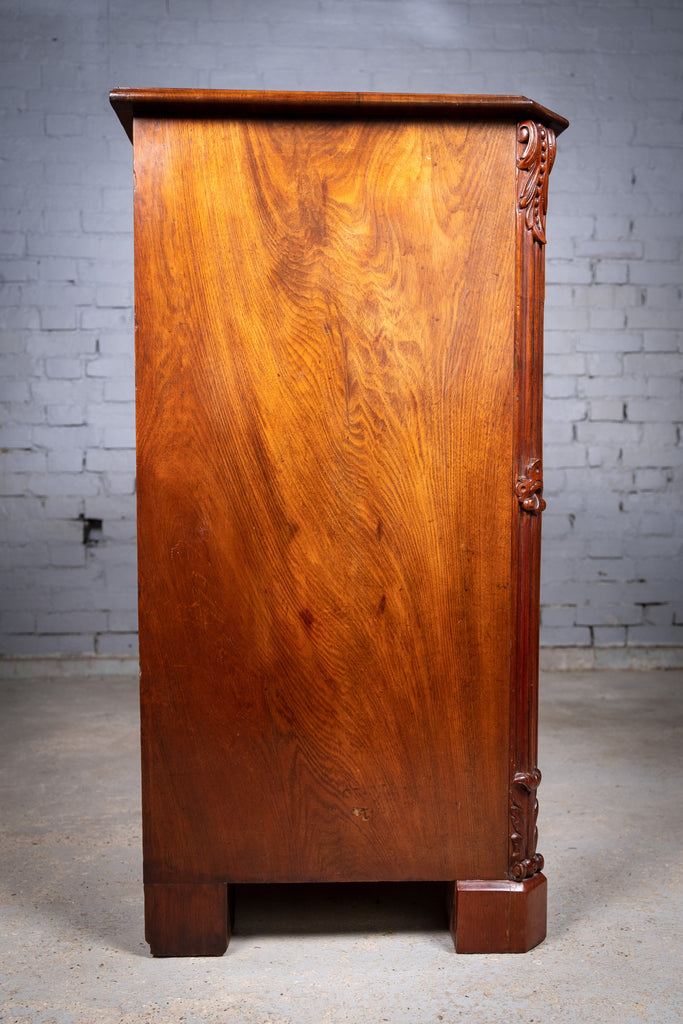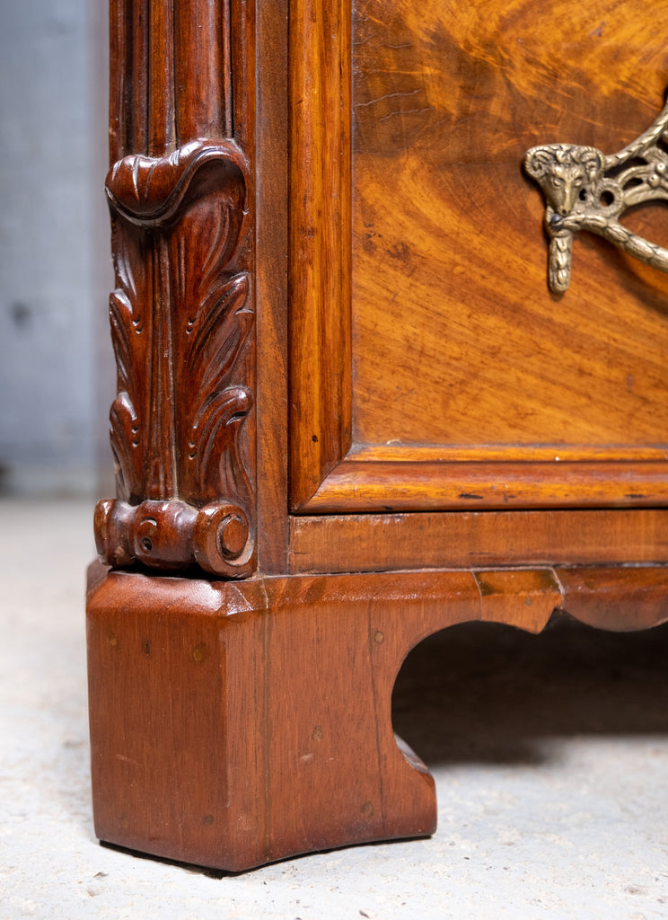 The piece is of truly exceptional quality throughout. Four large graduated drawers with original rams' head brasses are flanked by two columns adorned with finely carved foliate detail, all above bracket feet. The colour of the wood is outstanding and really does glow when caught by the light.