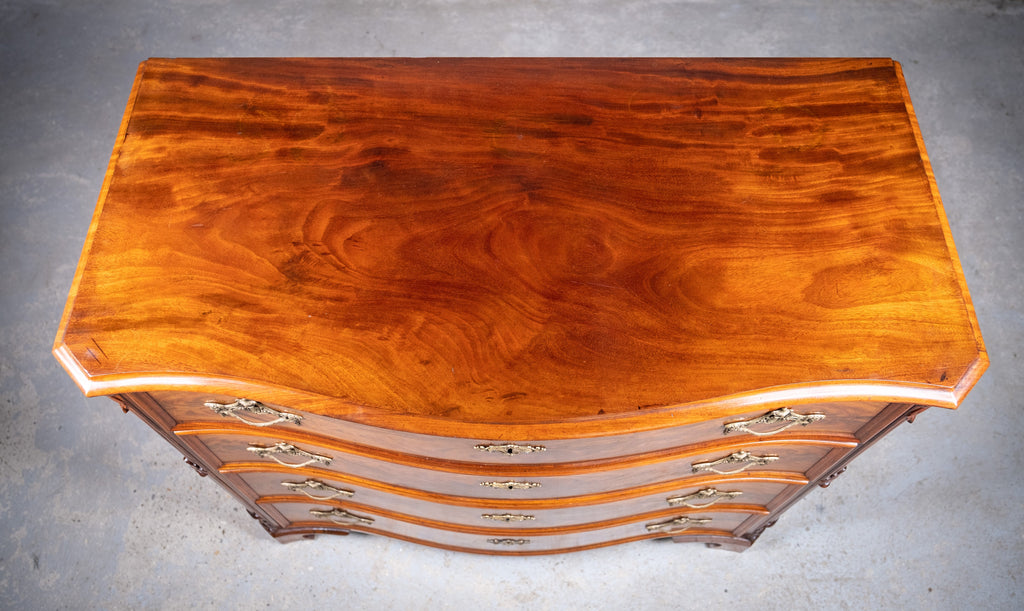 A stunning mid-19th century Swedish serpentine flame mahogany chest of drawers, c.1850, with the original maker's label 'P. G. Axner, Snickare [Carpenter], Stockholm, Oxtorget No 6', retained to the inside top drawer.