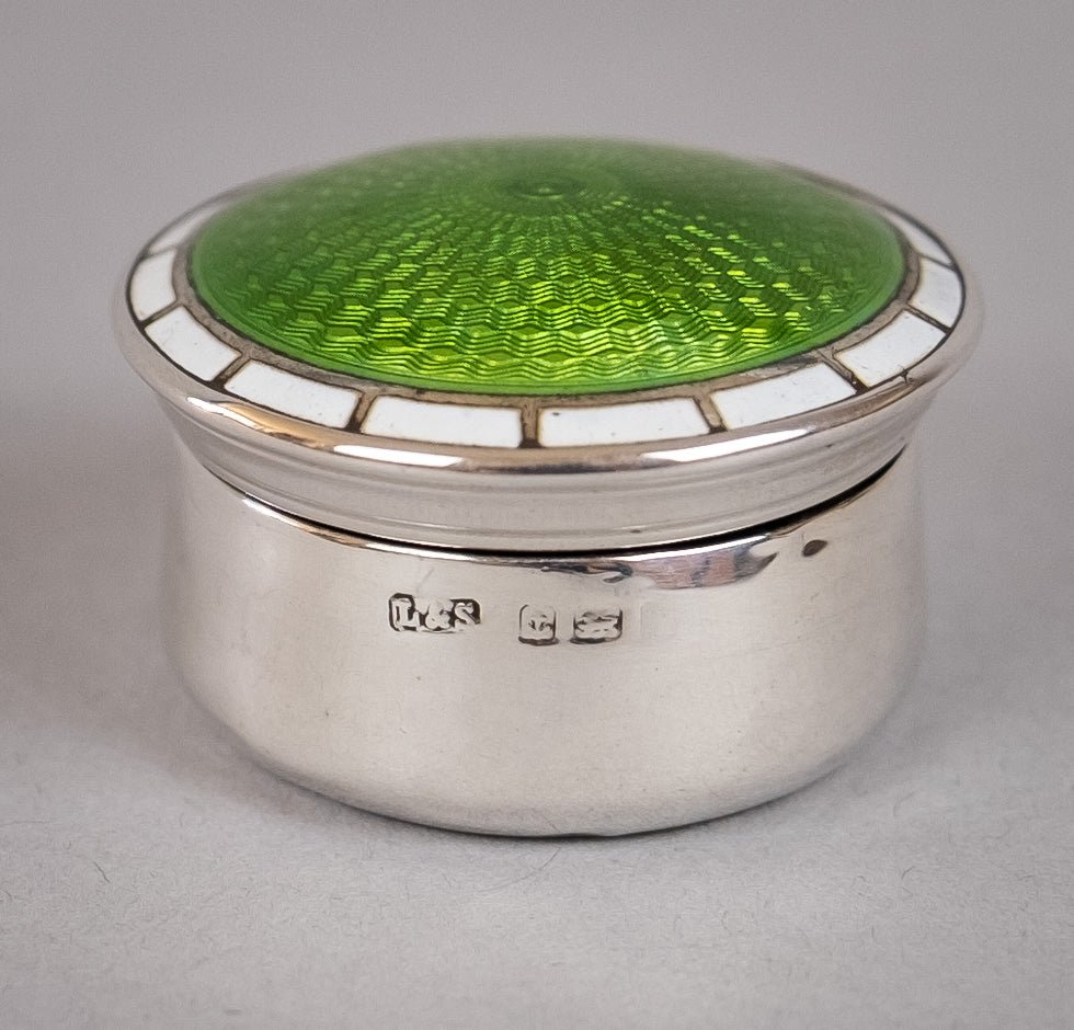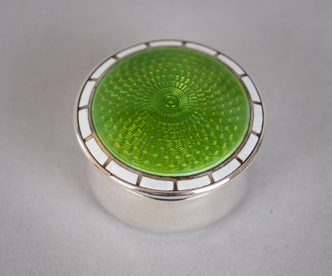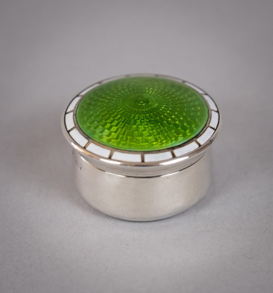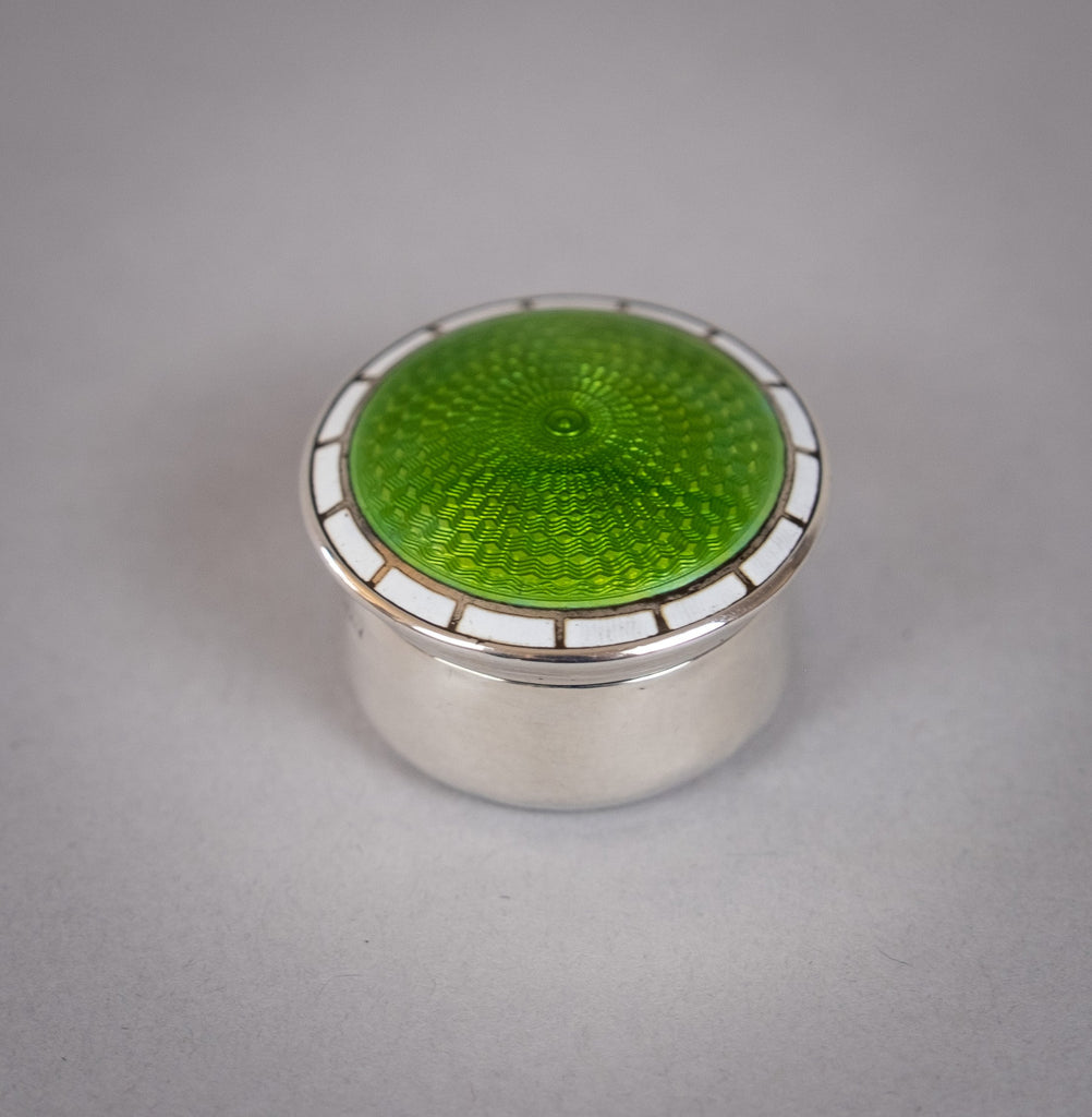 A stunning rare sterling silver, green guilloche enamel and white enamel pill box by Levi & Salaman, Birmingham. The date stamp is rubbed but this particular design dates to 1910.