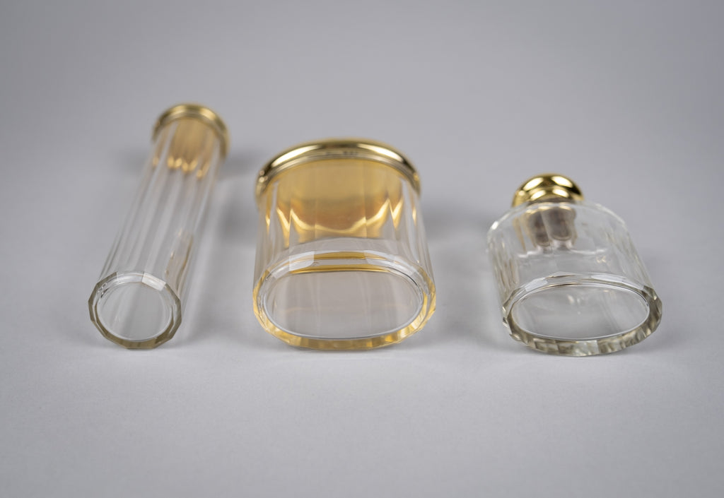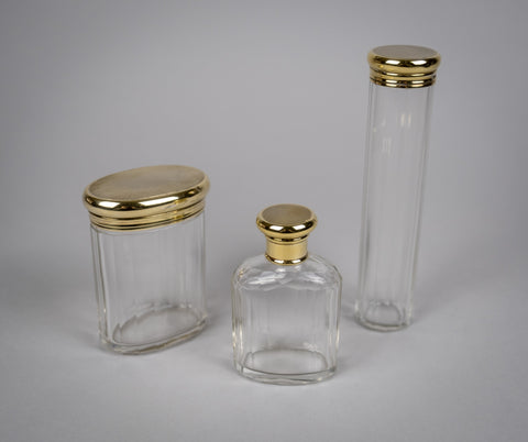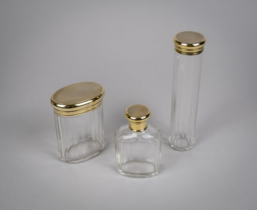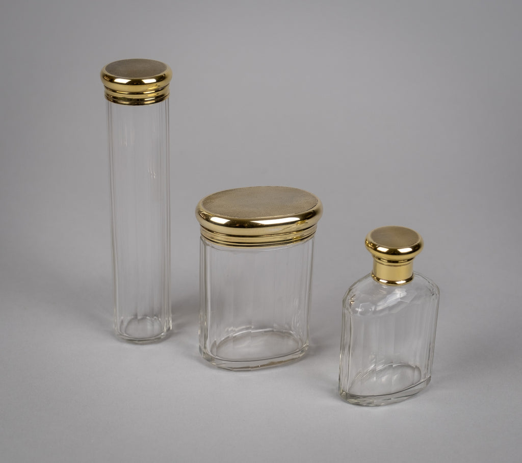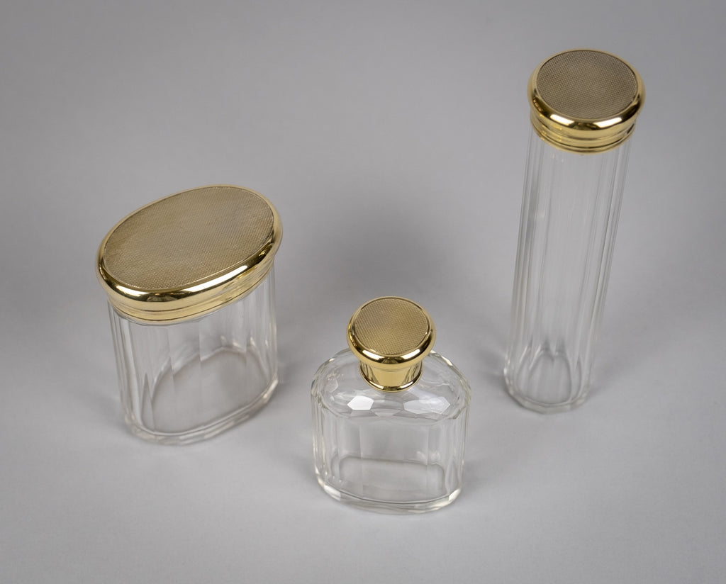 Each jar remains in a very good condition with only minor wear commensurate with age, namely a very small kink to the centre lid of the middle sized jar, a small dink to the scent bottle near the hallmarks and some small areas of rubbing to the silver gilt. The set remains in a wholly original condition, with the scent bottle still retaining the smell of a decadent perfume.