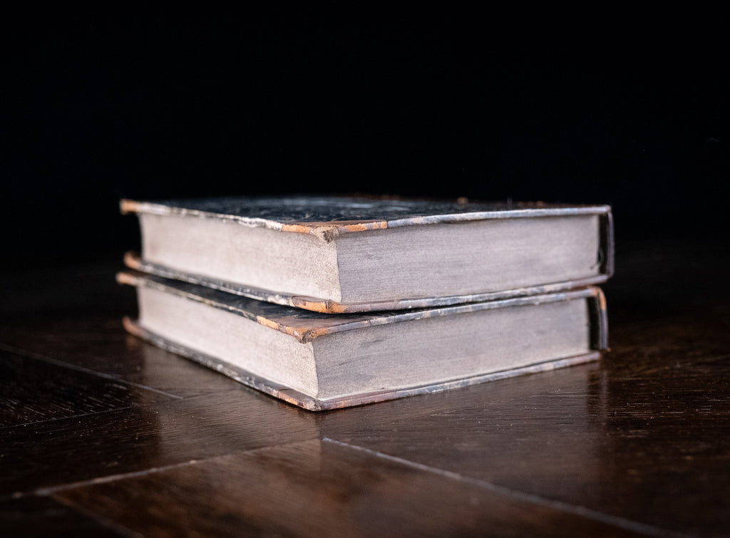 Both volumes are three quarter bound in a tan leather with gilt-stamped title and five raised bands to the spine. Marbled boards. Both volumes have shelf wear to the extremities. Volume I has wear to the title panel. The binding of Volume II is a little weak but does remain bound.