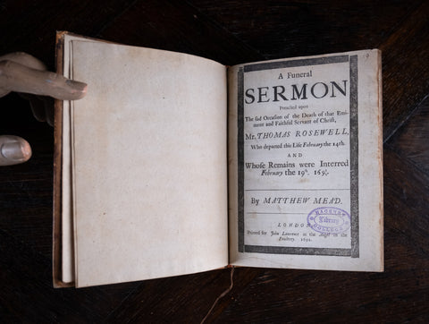 'A Funeral Sermon Preached Upon The Sad Occasion of the Death of that Emiment and Faithful Servant of Christ, Mr Thomas Rosewell, Who Departed This Life February the 14th....1692', by Matthew Mead. Printed for John Lawrence, London, 1692.